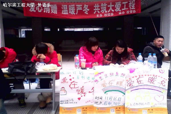 11月17日上午8时30分至下午3时,校青协举办的“暖冬计划”在启航阳光大厅顺利进行。由各个院系的实践部和系青协带领同学们进行募捐物品的捐赠。外语系的青协成员及校青协的工作人员,精神抖擞地进行着自己的工作,工作秩序井然。这次活动旨在为学校的贫困学生提供过冬的行装,同时也在呼吁广大同学奉献自己的爱心。
