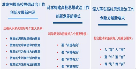 党的十八大以来,习近平总书记就教育工作发表了一系列重要论述,特别是在全国高校思想政治工作会议上的重要讲话,集中体现了总书记的教育思想,是新时期指引高等教育事业改革发展的纲领性文献。深入学习贯彻习近平总书记重要讲话精神,必须把握新内涵、构建新模式、落实新要求,切实推动高校思想政治工作创新发展。