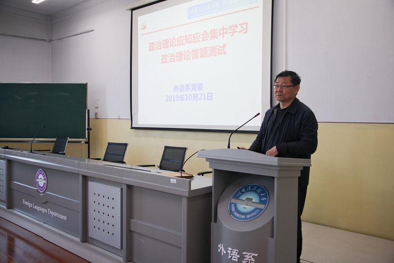 10月21日13:00,外语系党委在41#楼422组织教职工党员开展政治理论集中学习及测试答题活动。集中学习和测试答题由系党委书记赵欣主持,全体教职工党员参加。