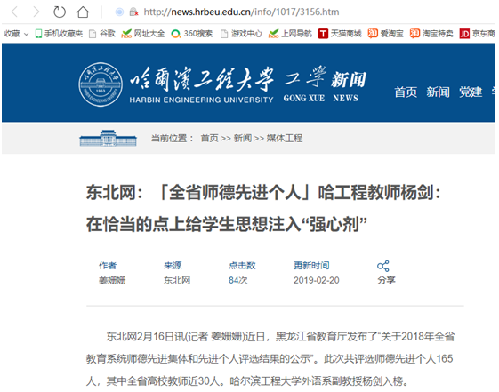 5. 以爱为基、以德为魂,思政教育融入英语教学与教师培养工作。作为团队党支部书记,将思政教育与党建工作和大学英语教学与教师培养工作有机结合,通过定期集体备课与政治理论学习、“主题党日我主持”、“课堂思政”方案设计比赛等活动,使之规律化、制度化、常态化。以基层文明单位建设与党建工作中的优异成绩和创新做法,提升教师思想与思政工作水平,助推思政工作融入大学英语教育教学的改革与实践。2017年党支部获评学校先进基层党组织、被推荐参评黑龙江省普通高等学校“百优”党支部及2018年新时代高校党建“双创”工作样板支部,杨剑获评学校优秀党务工作者。
