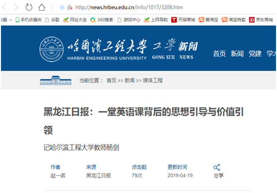 “好老师加上先进的教育理念就会让教育活灵活现。我很幸运,搭载上了哈工程英语教学改革的航船,这种课下以问题为导向自主实践学习和课上小组讨论与展示相结合的新型教学模式,考验的是两头功夫:老师备课的深度和学生自主学习的厚度。”杨剑说,“新模式英语课一个话题8个学时4次课,要想把这个过程走下来,老师和学生谁都甭想偷懒。”