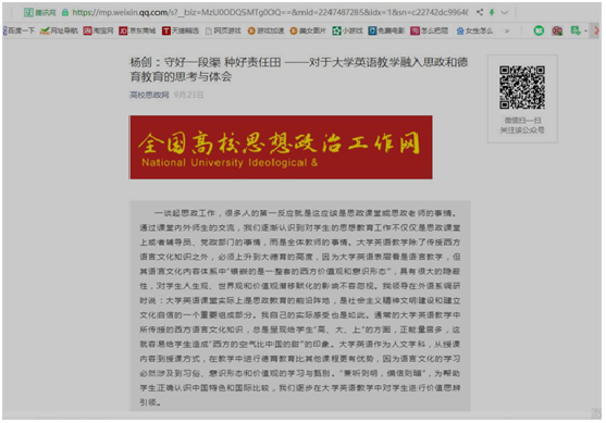以上实践活动,不但对学生进行了思政和德育教育,教师在思政和文化自信等方面也受到了同样的教育,实现了自身政治意识和文化水平的提升。《中共中央组织部 中共中央宣传部 中共教育部党组关于加强和改进高校青年教师思想政治工作的若干意见》、全国高校思想政治工作会议精神、习近平总书记针对高校思政工作的系列讲话,都对高校思政工作队伍提出了更高的要求。大学英语课程作为思政教育的“前沿阵地”,学生和教师都在其中直面中西方文化的交汇与冲突,教师自身思政水平和自身定力能否提升,决定了大学英语“课堂思政”的成败。未来,我和同事们将继续努力学习,尝试着常态化、系统化地在大学英语教学中对学生进行价值思辨引领,为实现学生的“四个正确认识”贡献力量。“守好一段渠,种好责任田”,大学英语教学中的思政和大德育教育永远处在进行时。