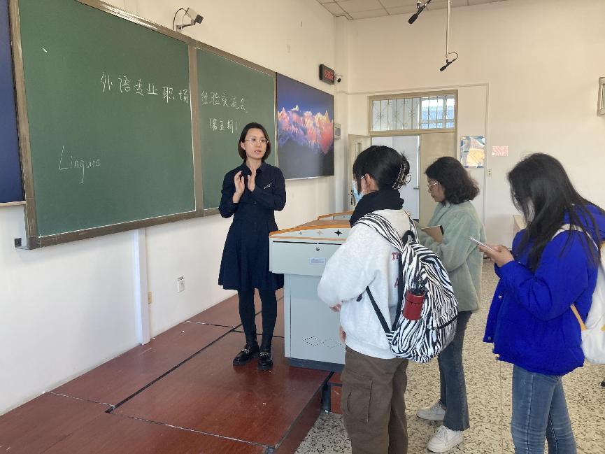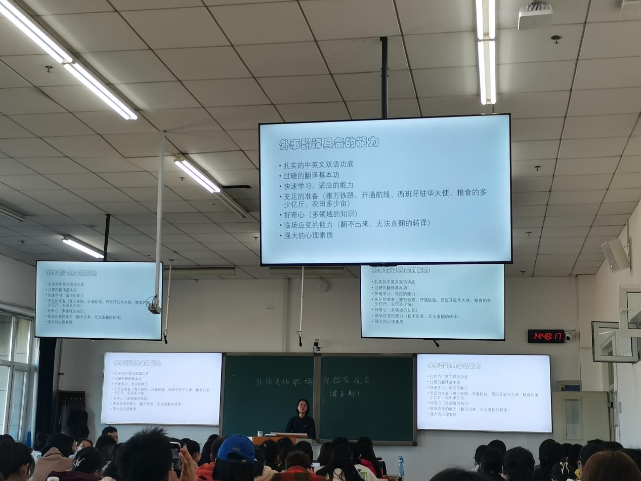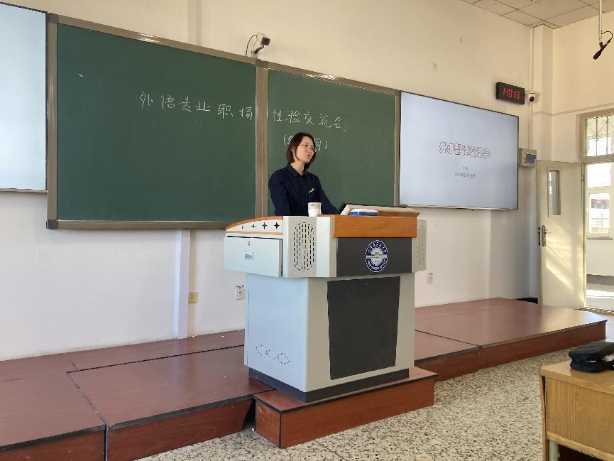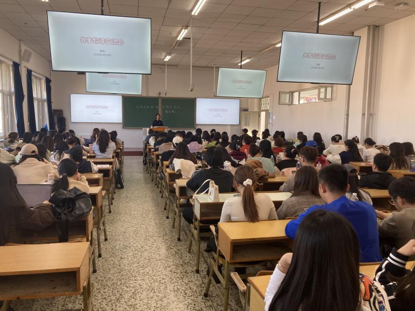 20231018日,更好帮助学生坚定专业自信,了解专业发展前景,做好职业发展规划,外国语学院邀请了黑龙江省人民政府外事办公室李彤,在21B#5087教室举办第五期外语专业职场经验交流座谈会,活动研究生辅导员张文智主持,外语学院大一、研一新生和大四、研二、研三近170名同学参加