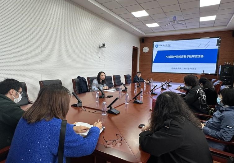 2025年5月8日下午,外国语学院在41号楼417室成功举办AI赋能教育教学交流会,聚焦AI如何赋能专业与课程建设,旨在推进外语教育教学的数智化转型升级。会议由教学副院长王丽丽主持,由智慧树平台和超星平台讲师主讲,学院基层学术组织负责人和骨干教师参加。